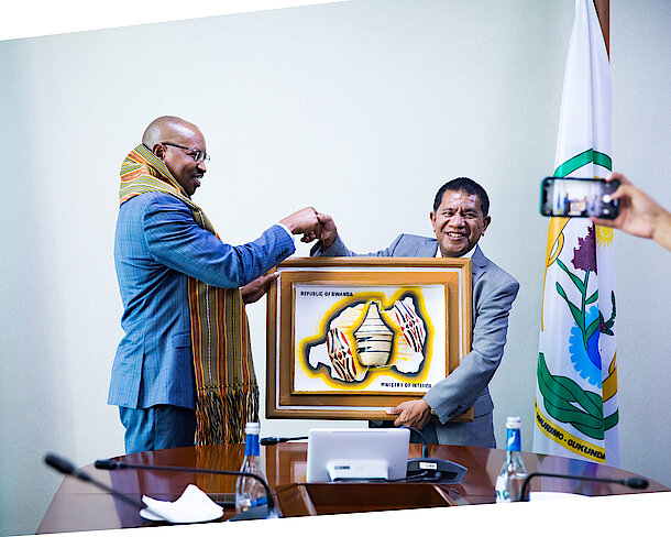 On Thursday 16 May 2024, the Minister of Interior, Hon. GASANA Alfred received a delegation from the democratic Republic of Timor-Leste led by Mr. Jacinto Rigoberto, Vice Minister of the Ministry of State Administration and Dr. Helder da Costa, Secretary General of the Group of Seven Plus (g7+). The delegation came to benchmark on the integration of peace building process into communities, the work of the Ministry of Interior, as well as policies, strategies and initiatives in place to ensure internal security, peace and stability.