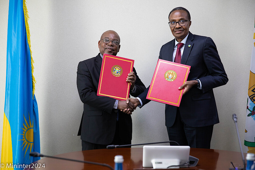 Ce jeudi, 22 Février 2024, le Ministre de l'Intérieur du Rwanda (MININTER), l'Hon. Alfred GASANA, représenté par le Ministre de la Gestion des situations d’Urgences (MINEMA), le Gén. Maj (en retraite) Albert MURASIRA, a signé un mémorandum d'entente en matière de Sécurité avec le Ministre de l'Intérieur et de la Sécurité publique, Contrôleur Général de Police de la République centrafricaine, Son Excellence Michel Nicaise NASSIN qui est au Rwanda sur invitation de son homologue rwandais.